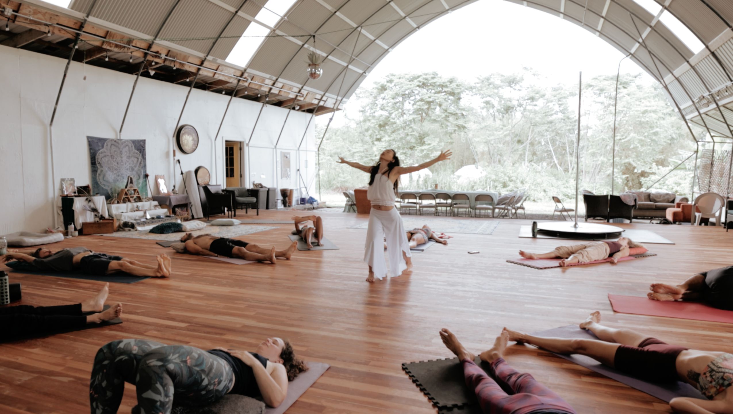 Woman in bridge pose in a Kundalini activation session.